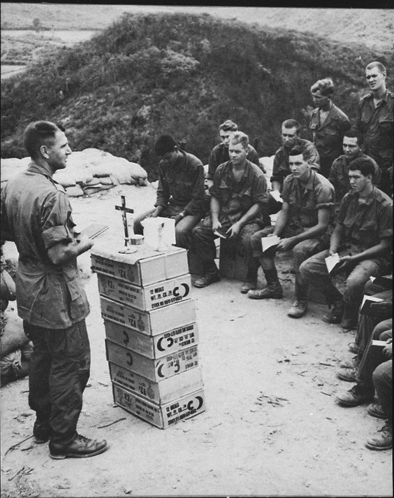 Another memorable experience on hill 52 was when the Chaplain came and brought hot food and a bag of gifts for everyone. The hot food: turkey, mashed potatoes and gravy, etc., was so good, but I wasn’t use to it and it made me sick. Everyone in Vietnam had dysentery, but the hot food made it worse. Oh well, I guess it was worth it. I also really liked the gifts the Chaplain brought: a little living New Testament, some stationary, and a few other things. Everyone like it when the Chaplain came. He was like Santa Claus. And they liked it also that his sermons were short.