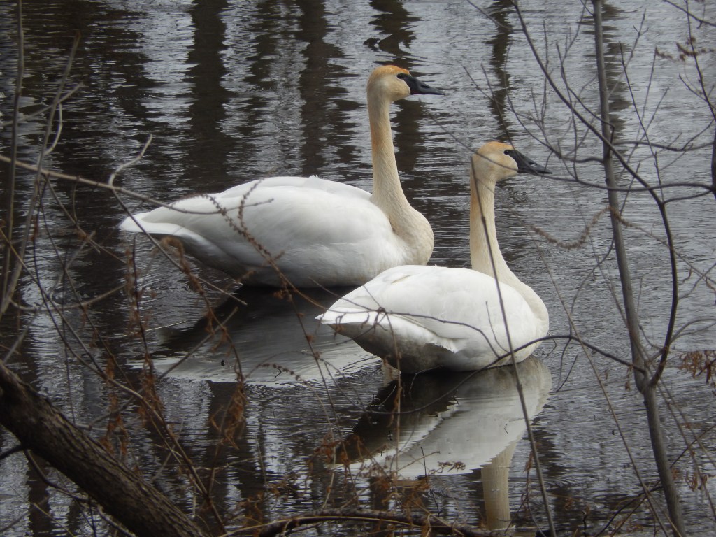 I walk around this small lake quite often, maybe once a week. This day was quite warm and I saw a few ducks and geese and even a turtle. As I rounded the lake I saw these two rather large white what looked like rocks–or could it be swans! Yes, it was a pare of swans with their heads tucked under. Then finely their heads popped up to see me. I have never before seen swans in this lake. I am thankful to God for their visit.