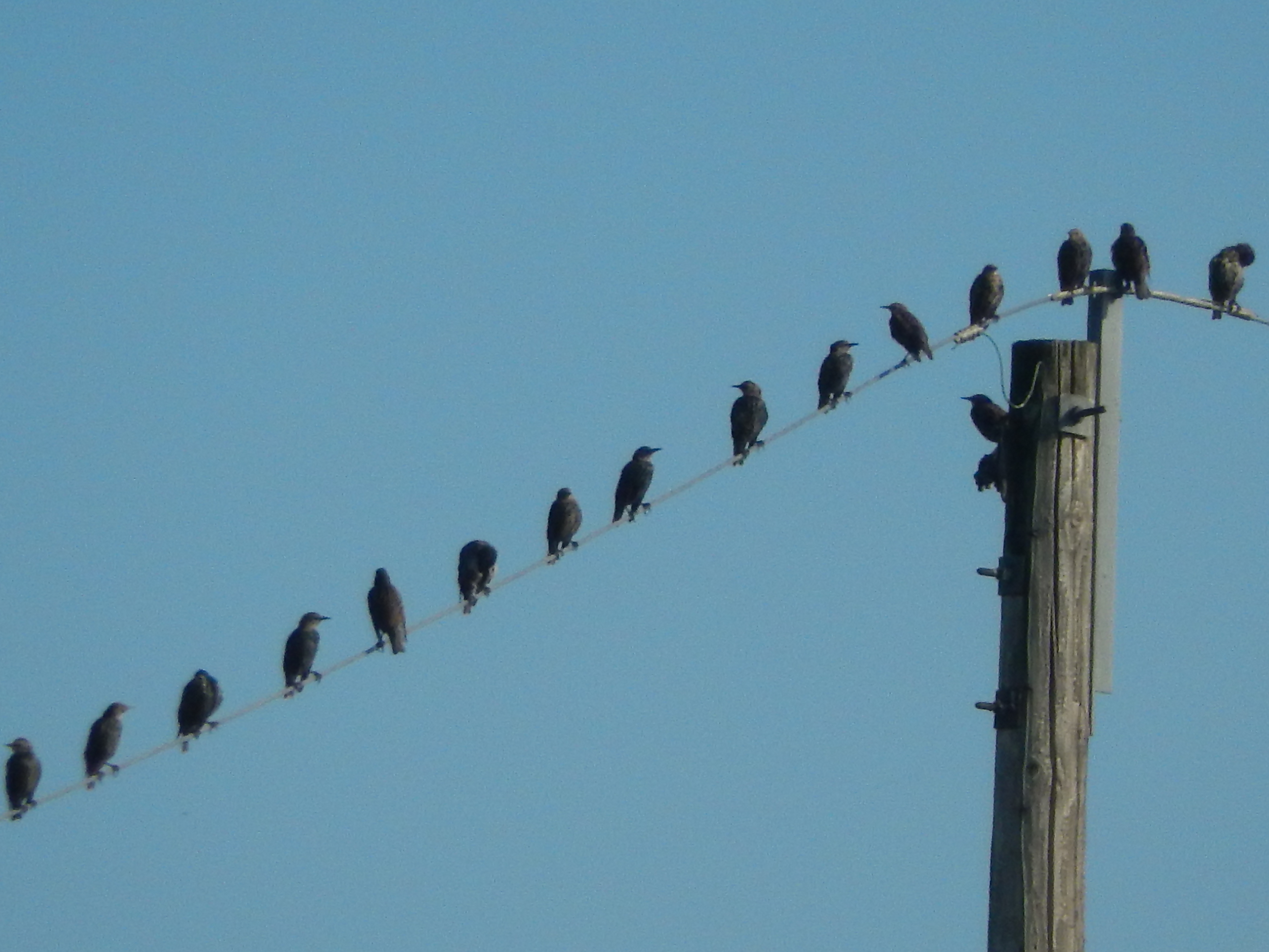 There is a special place where I like to walk because there are so many birds around chirping in the large trees. You can’t see them but you can sure hear them chirping happily. All at once they decided to leave the tree. They flew all together in a very large flock and landed on some old electrical wires. I’m not even sure they were connected. So many birds; I counted just over one-hundred of them. They sure seem to be a social animal. They like to just hang out together.